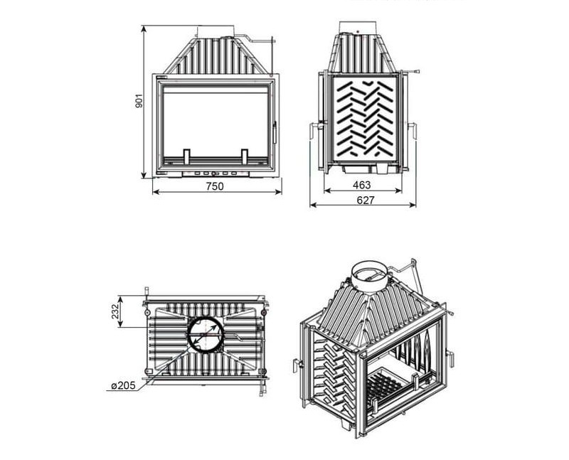 Каминная топка EVEREST A16Н две двери Каминная топка EVEREST A16H имеет топочную дверь установленную как с передней, так и с задней части. Топка изготовлена из качественного жаростойкого чугуна (ГОСТ 1412-85) с толщиной стенок 6-10 мм. Вес топки составляет кг. Модель рассчитана на обогрев помещений объёмом до 320 м³. Каминная топка имеет высокую Аккумуляционную камеру (дымосборник) и часто расположенные радиаторы на корпусе топки, которые обеспечивают высокий КПД и увеличивают мощность до 16 кВт. В Аккумуляционной камере (дымосборнике) установлен чугунный пламегаситель, Патрубок дымохода с внутренним диаметром 203 мм, оснащён поворотным шибером. Заслонка изготовлена из чугуна, а её положение регулируется ручкой на передней панели топки.